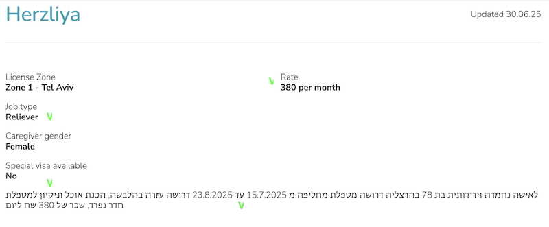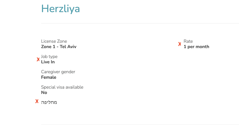 ❌ השכר המוצע הינו 1 שח. בני משפחה רבים חושבים שזה יהיה ברור למטפלים שזה לא השכר האמיתי, אך בפועל זה מוריד את הסיכוי לקבל פניות. יש לפרסם את השכר האמיתי שאתם מוכנים לשלם, לפי יום. הטווח כיום נע בין 360 שח ל 450 שח ליום